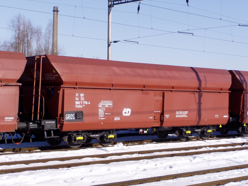Vierachsiger offener Selbstentladewagen mit Hand-und pneumatischer Bedienung der Entladungsöffnungen für Kohle-und Kokstransport im RIV Regime. Die Abdiechtung der Klappen ist durch Gummi oder die schrittweise Entleerung vorgesehen.