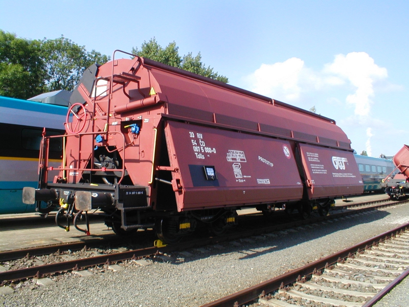 Vierachsiger Selbstentladewagen mit Sietenklappen und Schwenkdach für witterungsempfindliche Schüttgüter mit manueller oder pneumatischer Entleerung. Der Wagen ist durch den Umbau vonWagen der Bauart Falls 54 entstanden.