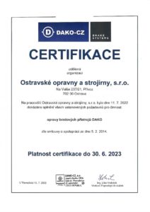 Certificate of repairs of DAKO brake devices, issued by DAKO-CZ, a.s. Třemošnice.
