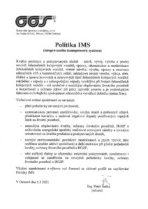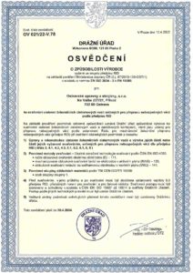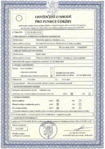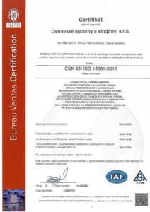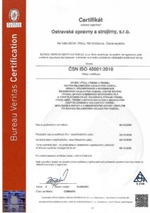 Quality management system has been audited according to ISO 9001 standard since 2000, environmental management system according to ČSN EN ISO 14001 standard since 2005, occupational health and safety management system according to ČSN ISO 45001 standardsince 2008. All management systems have been audited by BUREAU VERITAS CZECH REPUBLIC, spol. s r.o., Praha.