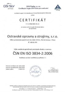Certificate of weldingaccording to ČSN EN ISO 3834–2, issued by SVV Praha.
