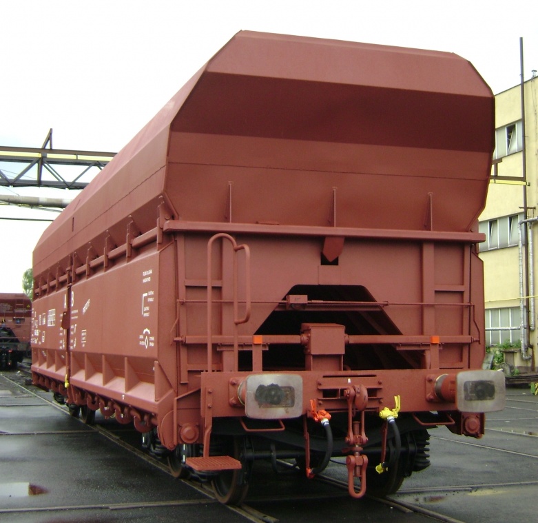 Four axle open hopper wagon with hand and air control of side flaps for transport of coal, coke and gravel, approved to international operation according to TSI.
